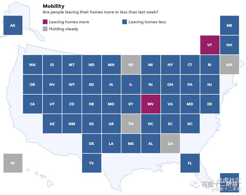 对美国人上周离家活动变化的统计:除了5个州维持稳定、2个州离家活动更多,其他州离家活动都更少了。。。