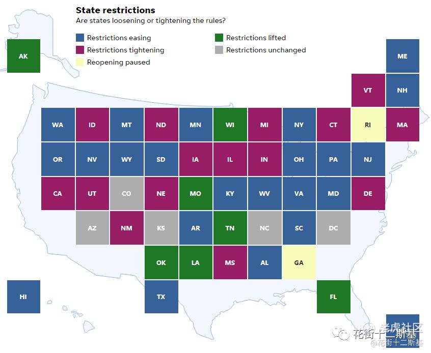 现在有23个州放松了限制措施,7个州解除限制;15个州收紧限制措施,2个州重启进程被叫停;还有5个州维持现有限制措施。