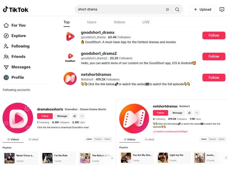 而DataEye短剧观察在TikTok网页版上观察,以“short movies或short drama”为关键词搜索,可以发现目前TikTok还没有的短剧进入端口和具体的短剧分类,但已经引入了一些海外短剧厂牌在TikTok内创建厂牌账号(类似于抖音剧场号的TikTok短剧剧场),且账号内有完整的短剧剧集分类。