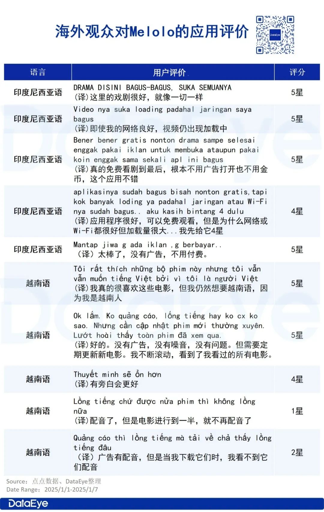 从点点数据平台的评论详情来看,印度尼西亚市场和越南市场均有用户评论和评分,印度尼西亚用户对Melolo的评分是4.7分,越南市场用户给出的评分为4.0分。评论反馈的问题主要为使用的稳定性、配音翻译、免费使用等。