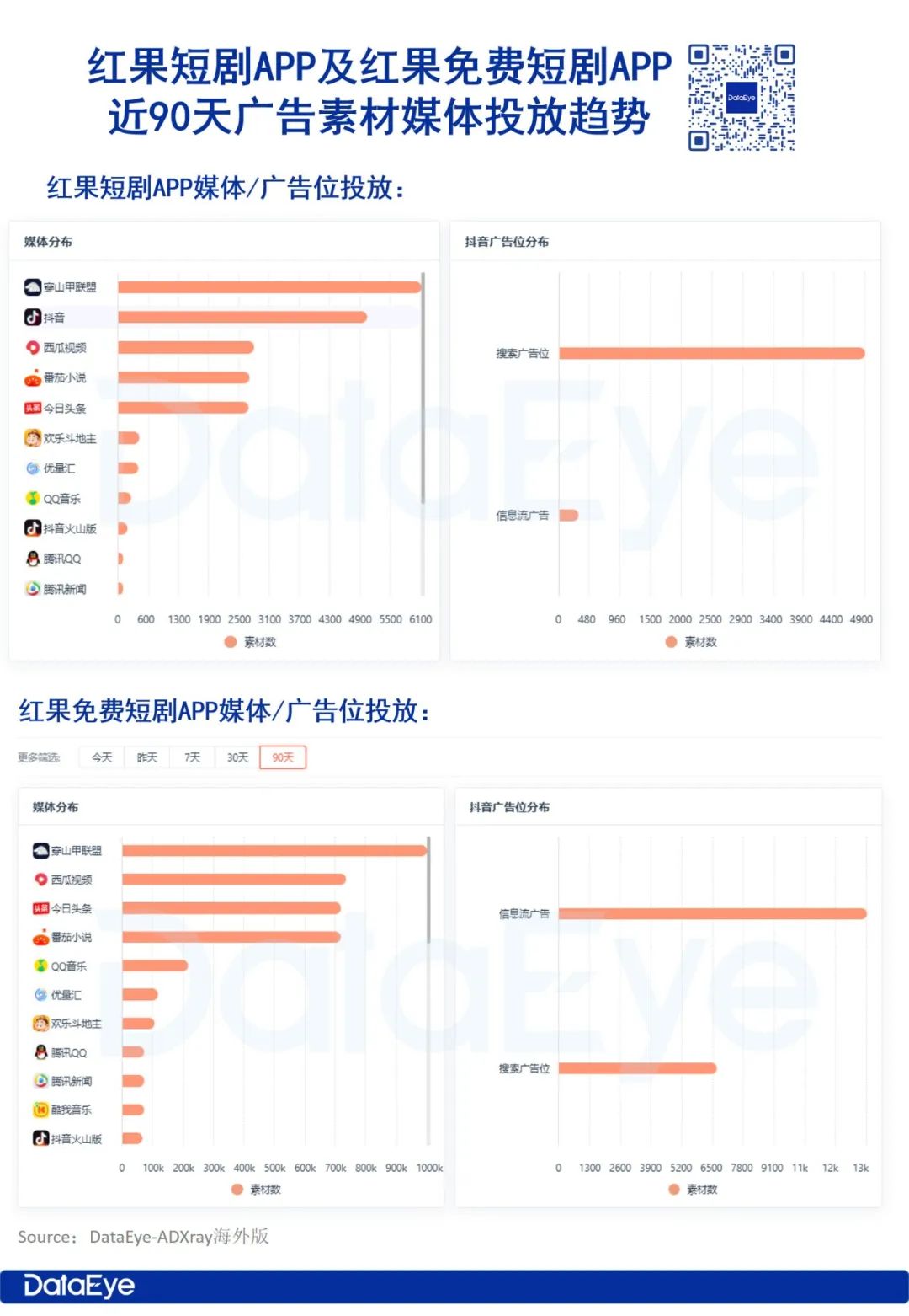 同样,在红果免费短剧APP的媒体广告位中,近90天素材投放数最高的分别是穿山甲联盟(999075组)、西瓜视频(734409组)、今日头条( 717339组),在抖音平台的素材投放数仅15867组。