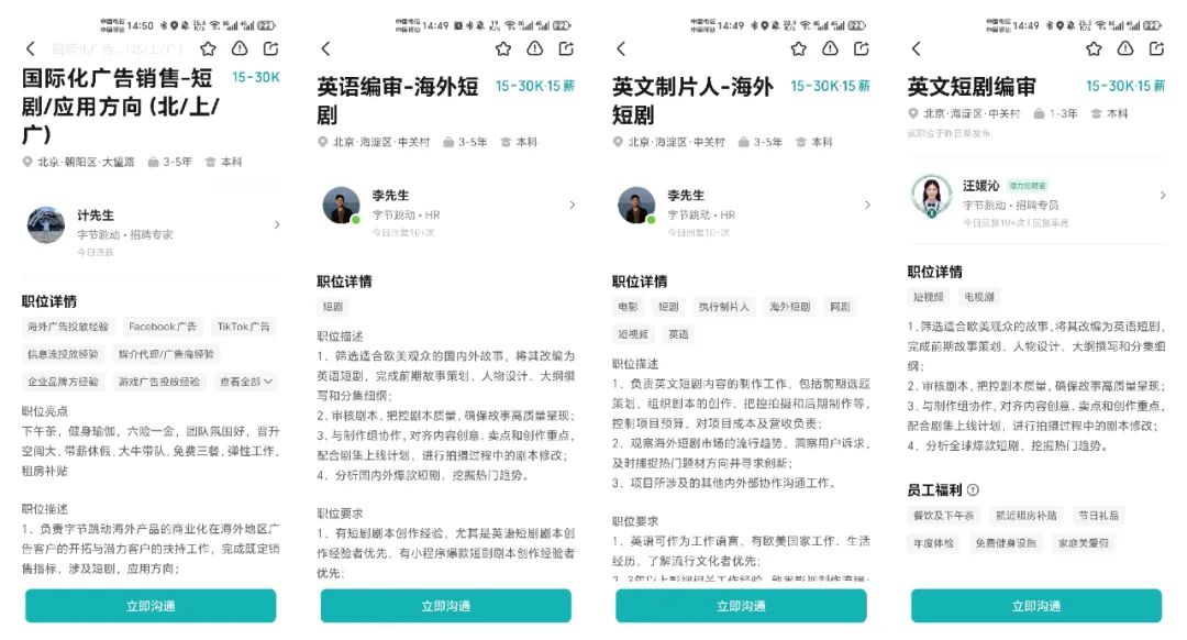 从某招聘平台看,字节跳动正紧锣密鼓组织海外短剧业务团队,并招聘多个短剧海外相关的职位,如短剧方向的国际化广告营销、海外短剧编审、英文制片人等,Base地在北京、上海等地。