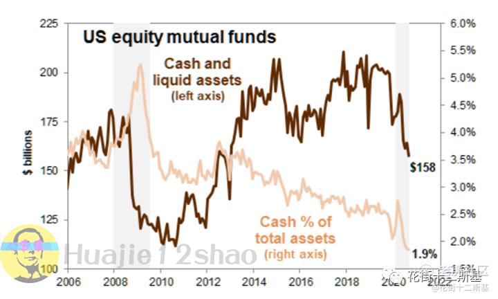 共同基金的现金余额在近几个月继续下降。美股共同基金持有的现金比例达到1.86%,达到历史最低。