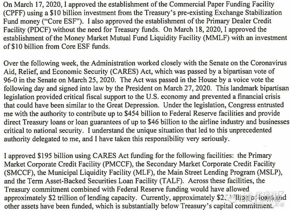 紧急贷款工具里面,你们还有4550亿刀没用上,这些钱先还一下。我们会重新安排,把其中4290亿刀用于财政部支持的美联储工具。