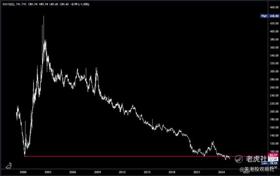 道琼斯指数除以纳斯达克指数是另一个代理指标,显示该比率已回到2000年的水平。
