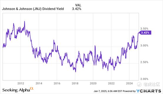 锁定3.42%的收益率并期待价格上涨的另一个理由来自于强生历史收益率的长期图表。自20世纪80年代以来,它们从未持续高于3.5%,并在2012年达到峰值,就在强生经历重大上涨之前。