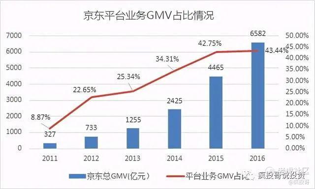 2010年12月,京东开放平台正式运营。京东GMV由2011年的327亿增至2016年的6582亿元,5年之间CAGR为82.2%。在这个过程中,平台GMV带来了巨大增量,体现在平台业务GMV占比也由2011年的8.87%提升至2016年的43.44%。