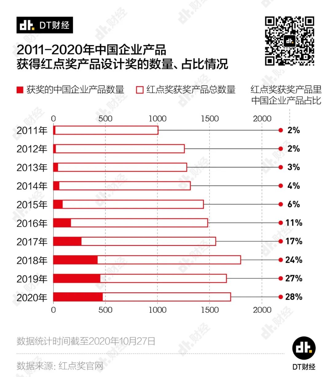 数据显示,2011-2020年间共有1万多件产品获得红点奖。2011年以来,获奖产品数量呈明显上升趋势,从2011年的1005件到2020年的1703件,十年来增长接近70% 。