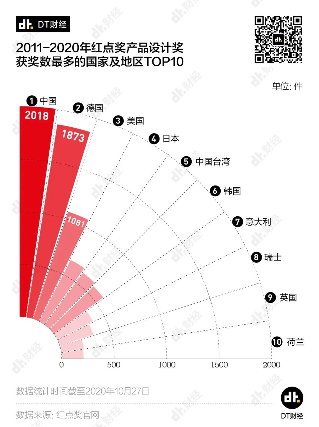 我们统计了2011年至2020年10月底不同国家的获奖产品数量,发现:中国是获得红点奖产品设计奖项最多的国家,甚至超过了红点奖的起源地德国。
