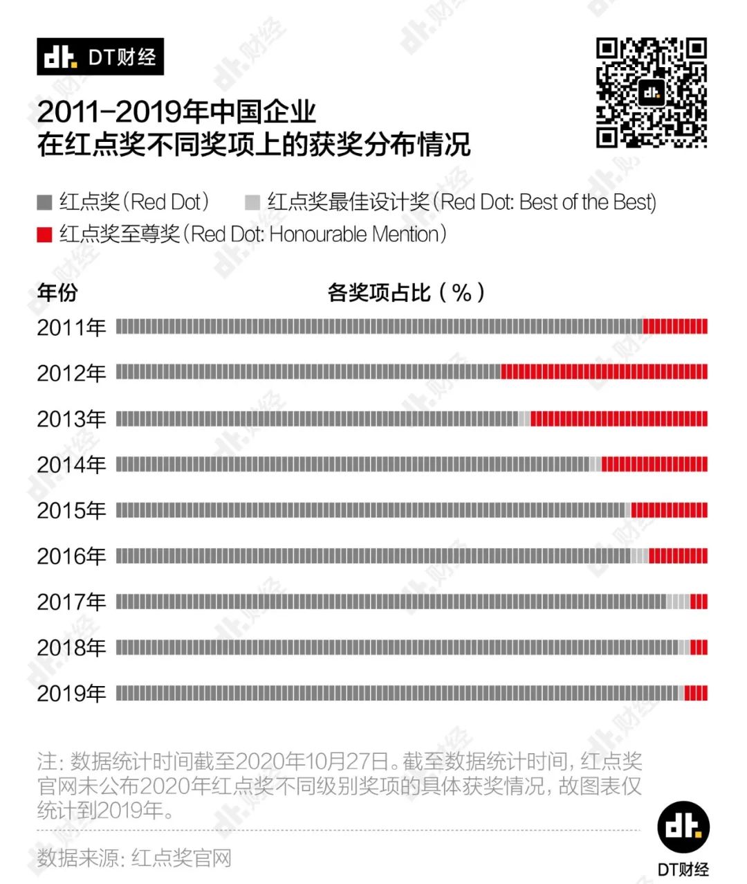 不同等级的奖项,对应的获奖作品数量也有很大差异。在2011-2020年间,每年颁发的1000多个奖项中,绝大多数都是没有最佳、至尊等附加头衔的普通红点奖。比如2020年颁发的所有红点奖中,普通红点奖占比超过95%。