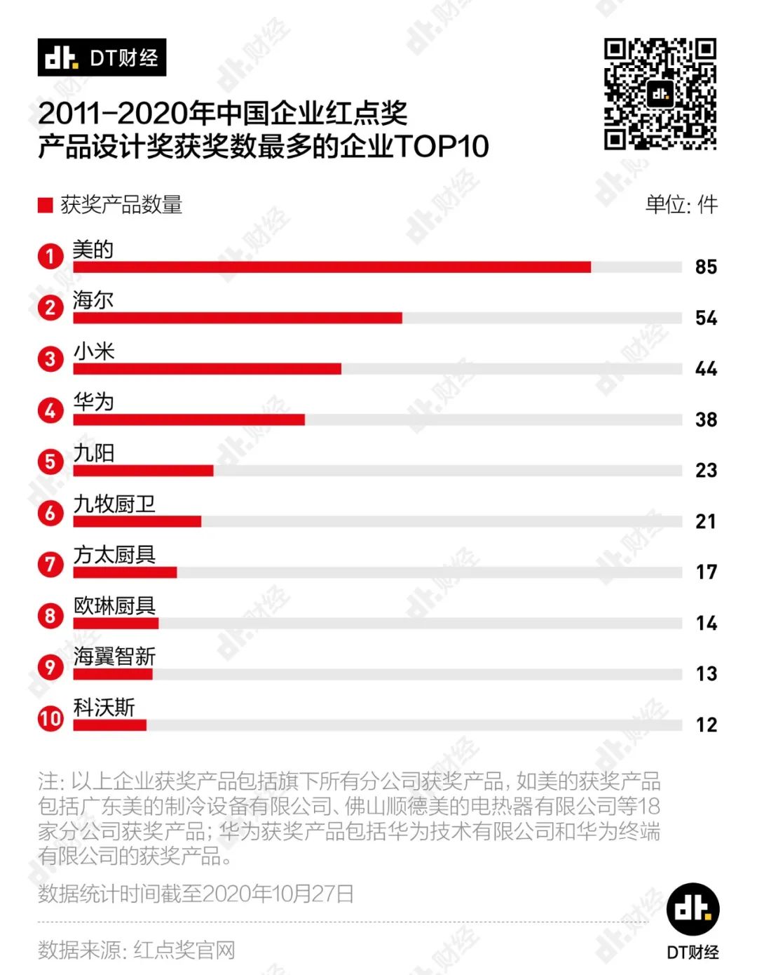 也有后来居上的选手。比如九阳2019年还排不进前10名,2020年就一举拿下11个红点奖,在中国企业中位列前五。