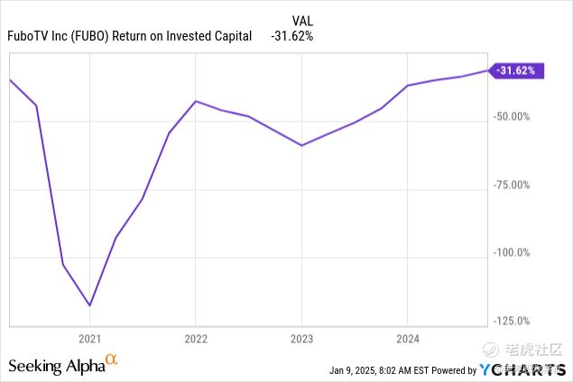 在第三季度末,公司拥有1.523亿美元的现金、现金等价物和受限现金,以及3.327亿美元的长期债务,主要是可转换票据。由于公司缺乏正的EBITDA和正的EBIT来支付债务的利息和本金,如果没有迪士尼交易,Fubo管理层可能需要通过股权或额外债务发行来筹集资金。该公司在其历史上一直是一个臭名昭著的资本毁灭者,2024年第三季度的投资资本回报率为-31.62%。没有保证市场会投资于另一次Fubo股权发行或债务筹集。