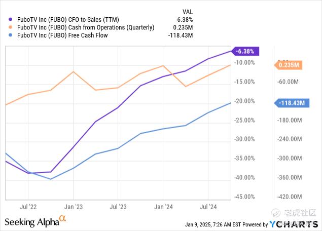Fubo TV过去12个月(“TTM”)的运营现金流(“CFO”)与销售额的比率自2022年中期以来有所增加,达到-6.38%,显示出向正现金流的显著进展。TTM CFO为235万美元。TTM自由现金流为-1.1843亿美元。