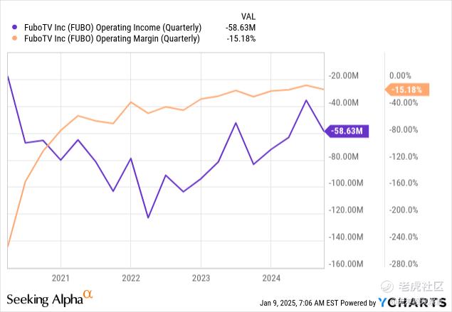 Fubo TV 2024年第三季度的运营费用增长10%,达到4.448亿美元。好消息是收入增长速度快于运营费用,这意味着公司正在缓慢实现盈利。坏消息是Fubo的第三季度运营收入仍然深陷亏损,亏损额为-5863万美元。运营利润率为-15.18%。