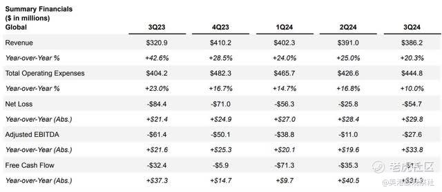公司来自持续经营的亏损为-5470万美元。每股摊薄亏损为-0.16美元,超出分析师估计的0.02美元。调整后的EBITDA亏损为-2760万美元,较2023年第三季度的-6140万美元有所改善。