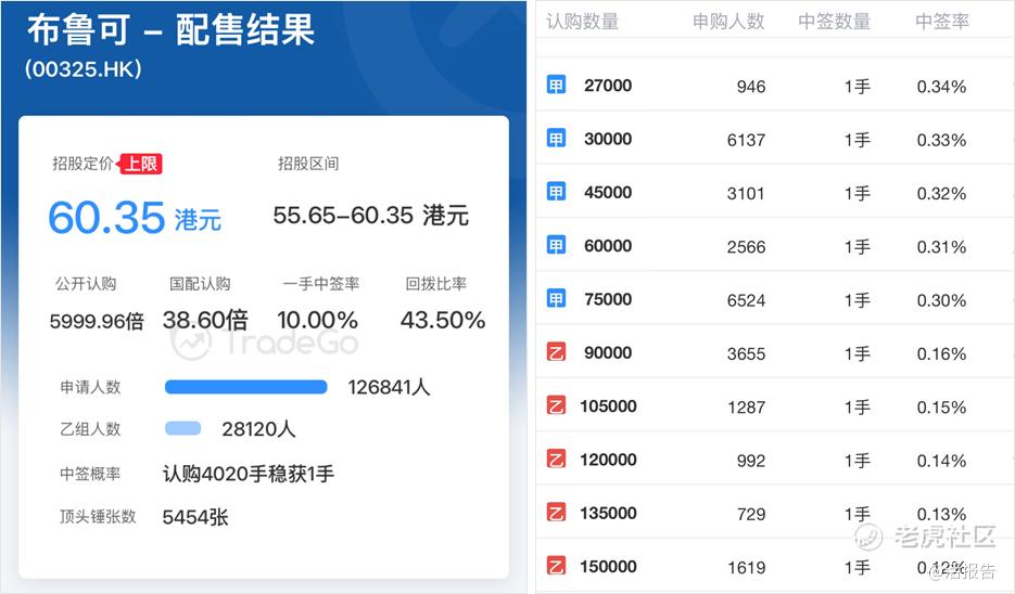 配售结果方面,本次申购人数高达126841人,其中乙组28120人,顶头槌5454张;公开认购倍数为5999.96倍,国配认购倍数为38.6倍;回拨43.5%,一手中签率10%。值得注意的是,此次甲尾的中签率要明显高于乙头。