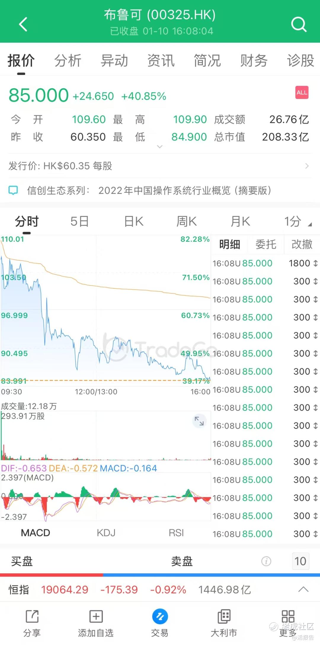 上市首日,公司股价大幅高开涨超80%,随后涨幅逐步收敛,至尾盘时收涨40.85%,最新市值208.33亿港元。全天成交2680.63万股,成交额约26.76亿港元。按实际可流通股份计,首日实际换手率高达96.64%。