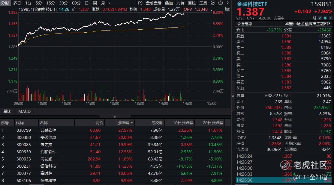 14日午后,金融科技全线爆发,板块涨幅持续扩大,北交所个股艾融软件大涨28%冲击30CM涨停,银之杰午后20CM封板,润和软件、同花顺、银信科技、赢时胜等多股涨超10%。