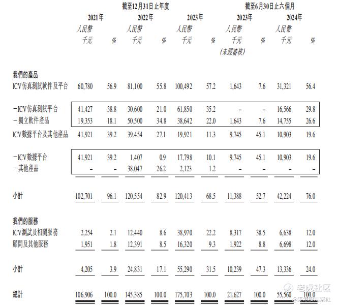 从收入结构来看,在过往记录期间,公司大部分收入源于 ICV 仿真测试软件及平台及 ICV 数据平台等产品的销售,通常按项目产生,具有非经常性特点。例如,在 2021 年、2022 年和 2023 年,ICV 仿真测试软件及平台的收入分别为 60,780 千元、81,100 千元和 100,492 千元,占当年总收入的比例分别为 56.9%、55.8% 和 57.2%;ICV 数据平台及其他产品的收入分别为 41,921 千元、39,454 千元和 19,921 千元,占比分别为 39.2%、27.1% 和 11.3%。而 ICV 测试及相关服务和顾问及其他服务收入虽相对较少,但呈增长态势。
