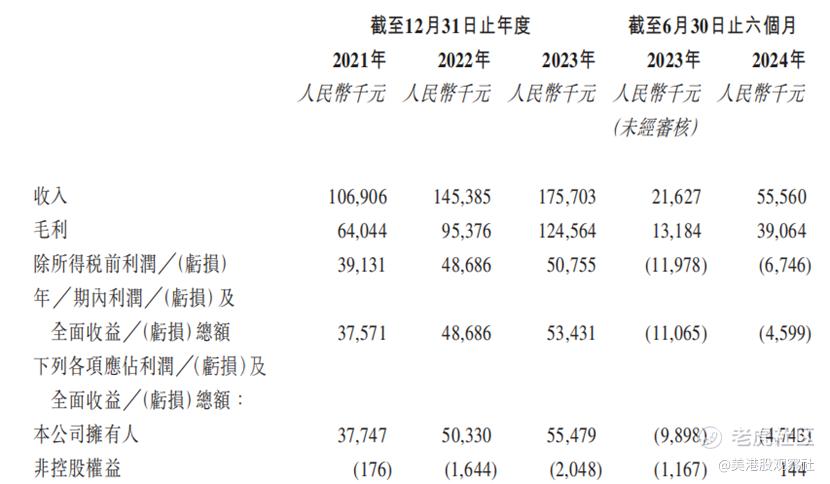 不过,在 2024 年上半年,公司收入为 55,560 千元,较 2023 年上半年的 21,627 千元有显著增长。但公司在 2024 年上半年出现净亏损,亏损额为 4,599 千元,相比之下,2023 年上半年净利润为 - 11,065 千元,亏损幅度有所收窄。从往年规律来看,公司下半年的收入要普遍高于上半年,如果从全年来看,2024年大概率仍为盈利。