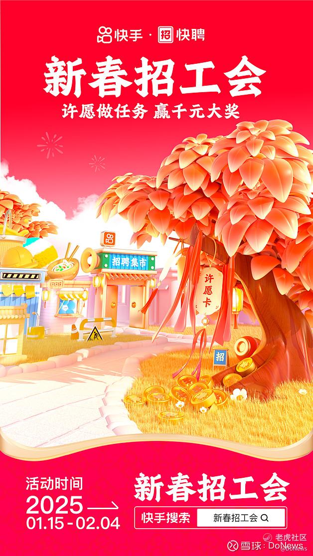 值得一提的是,1月15日至2月4日,快手快聘开启新春招工会场。用户点击许愿树,写下新年求职心愿。参与每日开宝箱抽奖,最高可得1888元现金红包。初一到初七,进入招工墙点击招聘海报,平台精准匹配新春岗位,还愿心仪岗位一键投递,只待开工大吉。