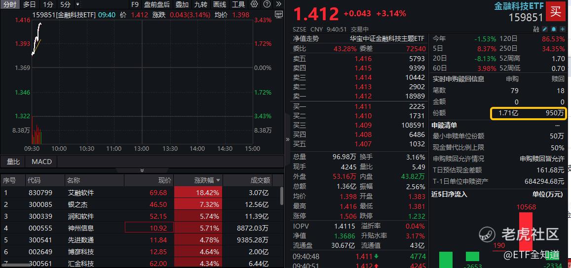 热门ETF方面,金融科技ETF(159851)场内价格开盘狂飙超3%,实时成交额快速突破1.3亿元,放量明显!资金疯狂涌入,开盘不到20分钟资金实时净申购超1.5亿份!