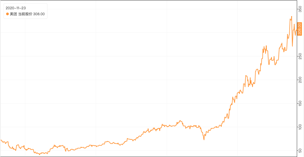 美团于2018年9月20日于港交所上市,当天美团点评股价整体波动平稳,收盘报72.65港元,略高于69港元招股价。由于之前小米上市结果惨淡,不少散户投资者也不甚看好美团。事实上,在上市的一年后,美团股价一直低于发行价,直到疫情前才开始“起飞”,从3月20日的低点84港元一路涨到现在的308港元。