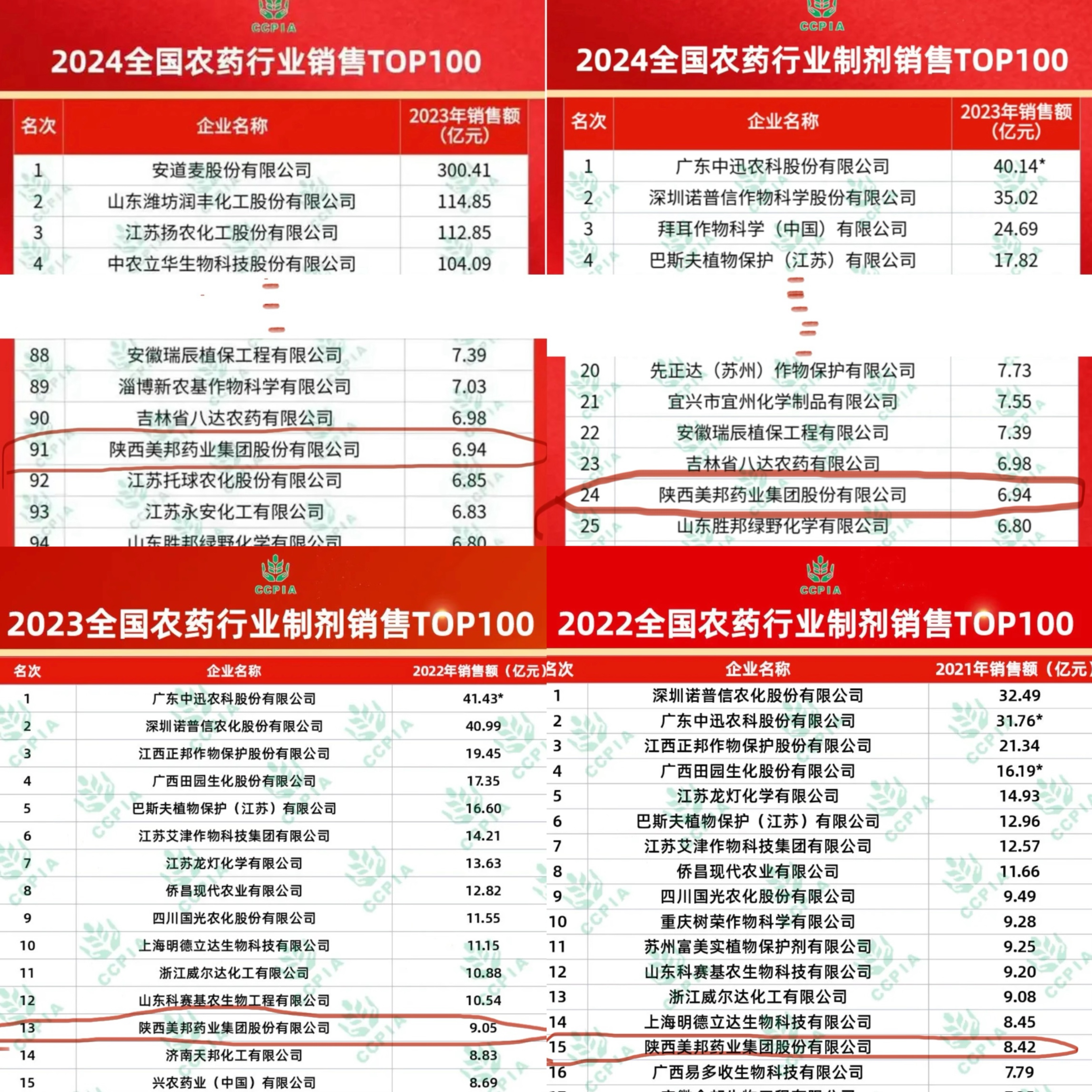 诺普信在2023全国农药行业制剂销售TOP100排名中位列第二,其销售额是美邦股份的4.5倍,最新32家上市公司当中排名第10。