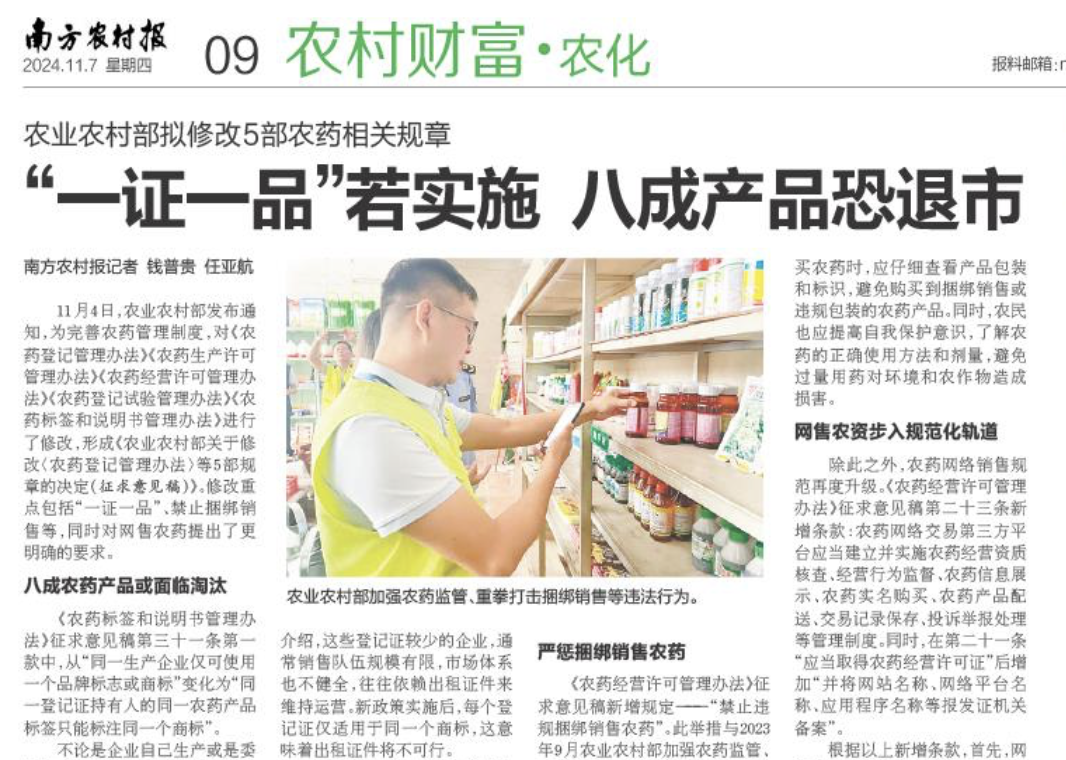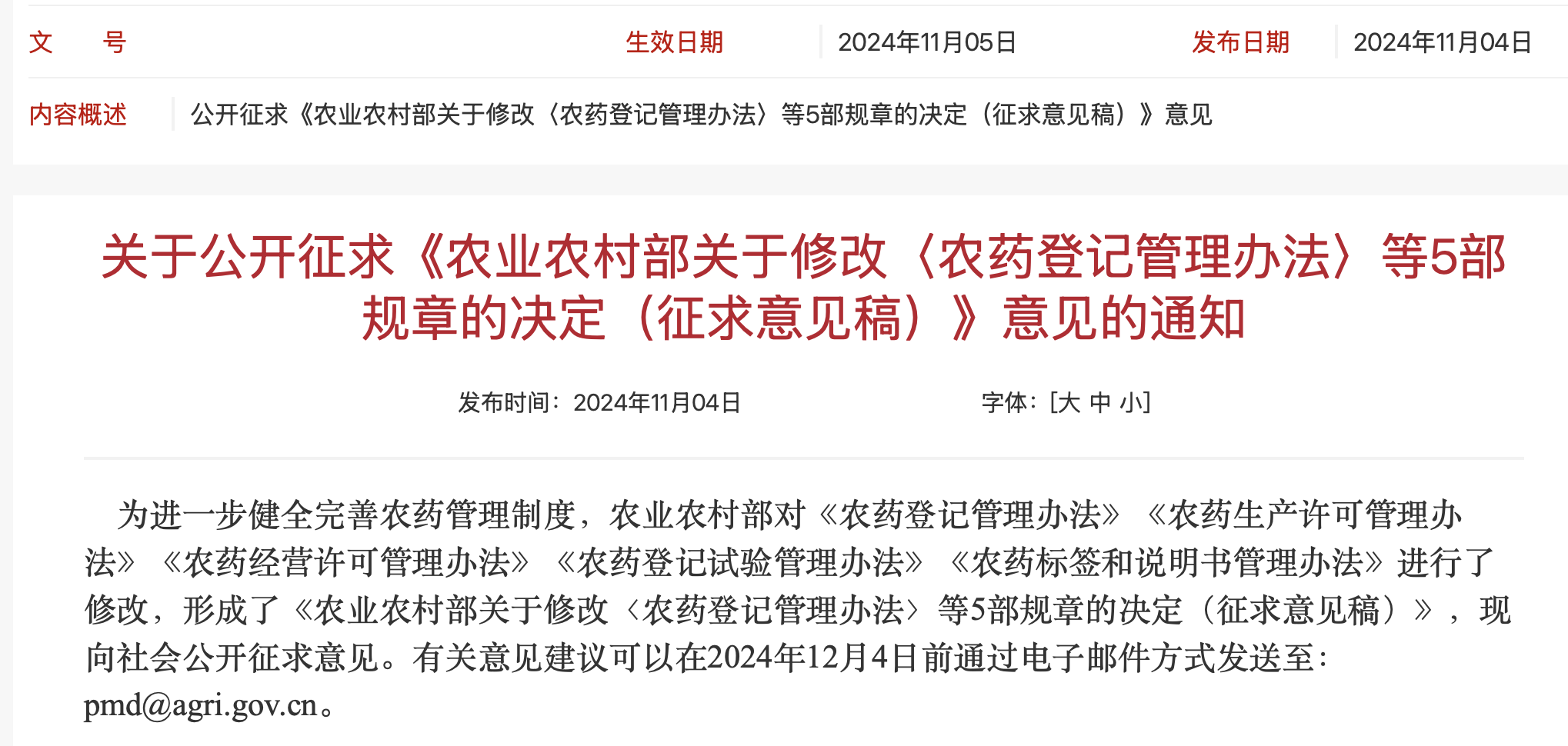 2024年11月4日,农业农村部公布《关于修改〈农药登记管理办法〉等5部规章的决定(征求意见稿)》。意见稿中被广泛关注的一处表述是明确提出“同一登记持有人的同一农药产品标签只能标注同一个商标”,即“一证一品”)。