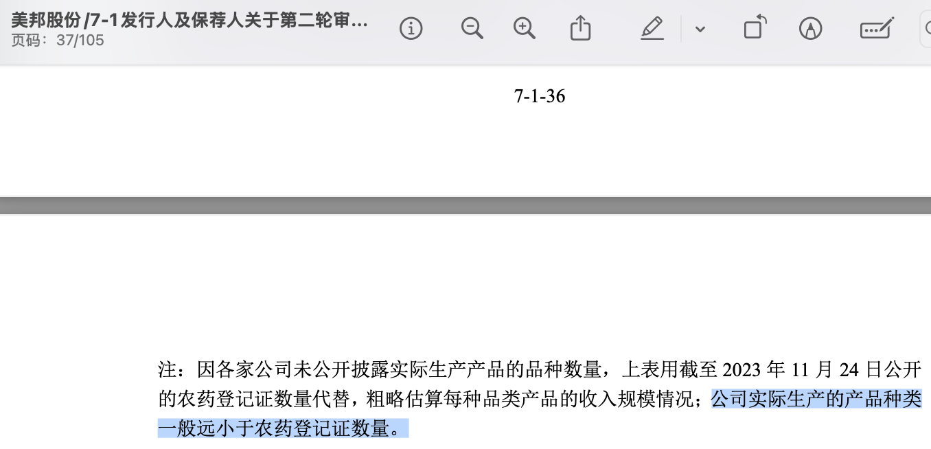 美邦股份在论证可转债项目可行性时,就单品效益比较进行的注释中也表示:“公司实际生产的产品种类一般远小于农药登记证数量。”