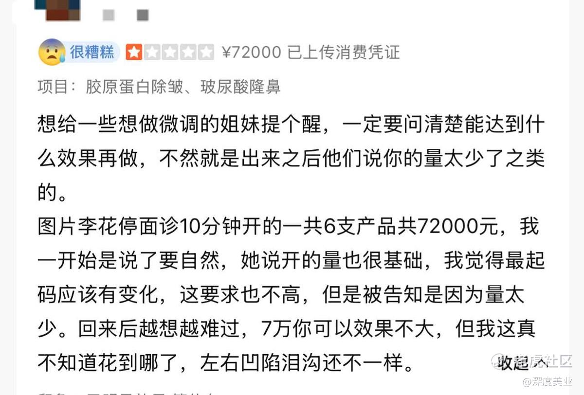 在2025年1月12日,这位消费者也在大众点评上留下了差评,分享了她的经历,并提醒其他消费者在进行类似的微调手术前,一定要问清楚能达到什么效果。她提到,尽管她的要求并不高,但术后的效果让她感到非常失望,甚至有些部位的情况比术前更糟。她上传了术前术后的对比照片,并在评论中表达了对手术效果的不满,认为花费的72000元没有得到应有的效果。