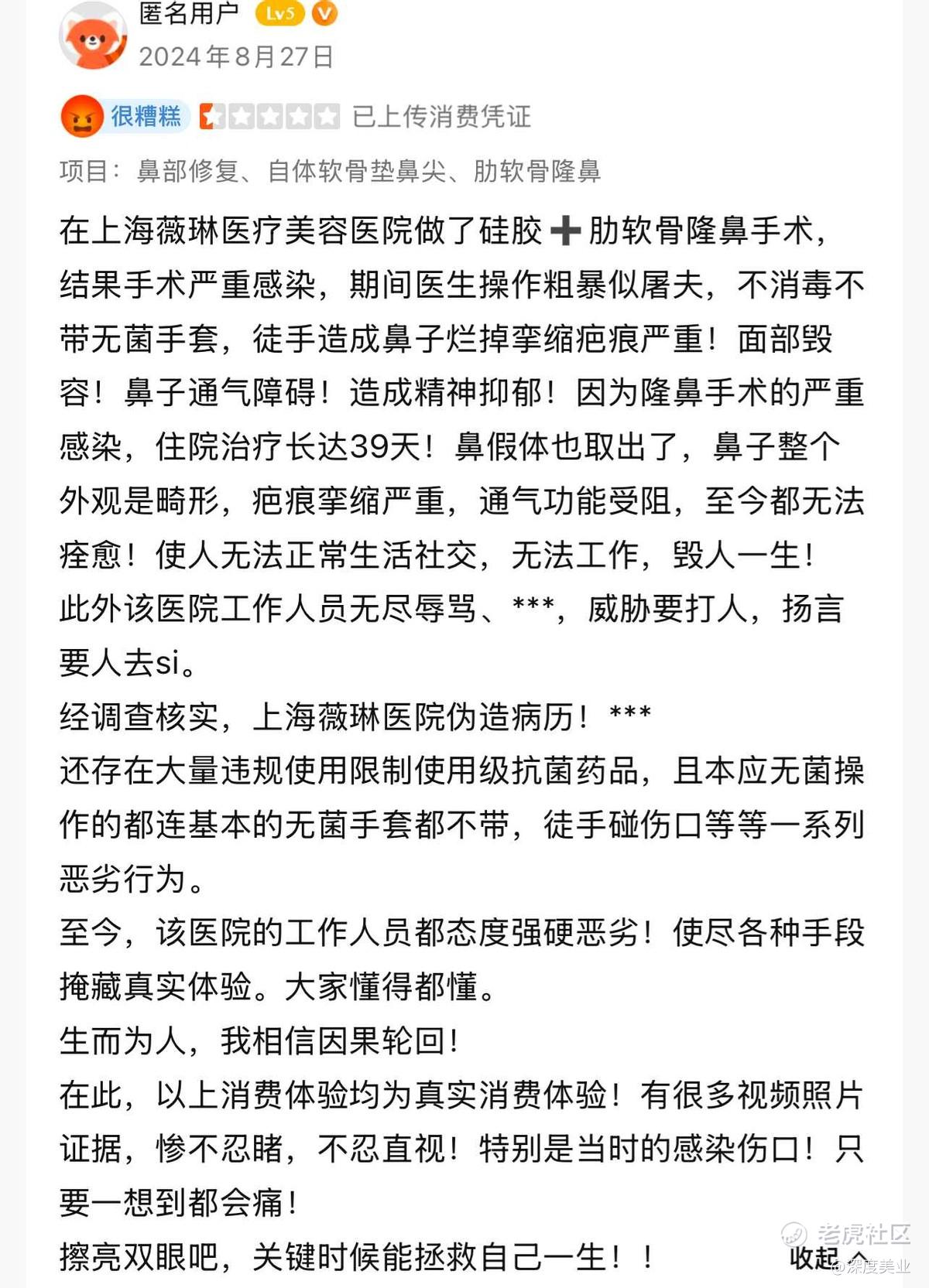 去年8月27日,一位消费者在上海薇琳医疗美容医院进行了硅胶和肋软骨隆鼻手术。