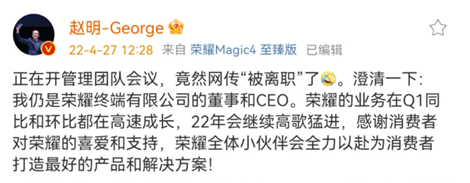 当时,荣耀正处于品牌重塑与市场拓展的关键阶段,“赵明从荣耀离职”传闻出现仅几小时后,赵明就第一时间站辟谣。