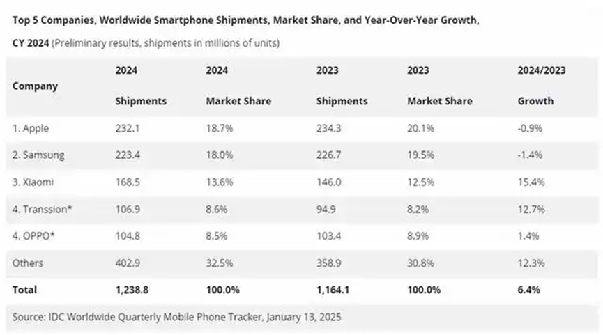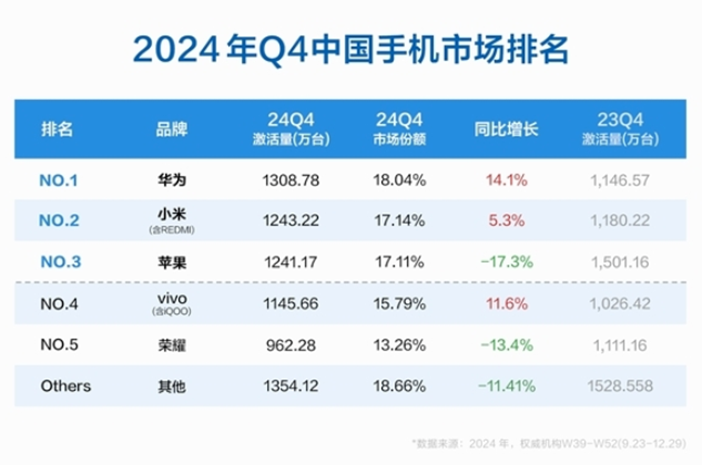 第三方数据机构IDC公布的2024年第四季度中国手机市场排名显示,荣耀新机激活量同比下滑13.4%。同时,其市场份额跌落至13.26%,在国内手机市场排名第五。