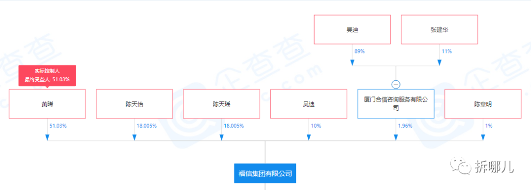 从福信集团的股东层,可以一窥这个家族的概貌。黄晞是最大的股东,占51%。其次是陈章辉的两个孩子,加在一起36%。然后是吴迪,他有10%的股份。最后,有少部分的股权分配给了张建华,以及陈章辉的兄弟陈章明。