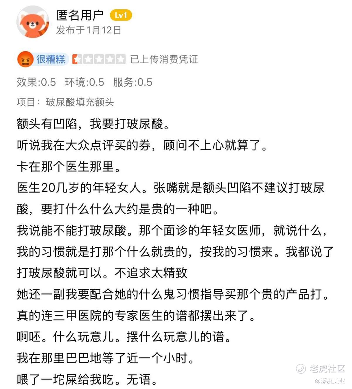 1月12日,一位消费者在大众点评上对苏州康美医疗美容的服务提出了差评。该消费者表示,她想要进行玻尿酸填充额头的项目,因为额头有凹陷。然而,她在购买优惠券后,遇到了一位20几岁的年轻女医生。这位医生建议她不要打玻尿酸,而是被推荐选择一种更贵的产品。
