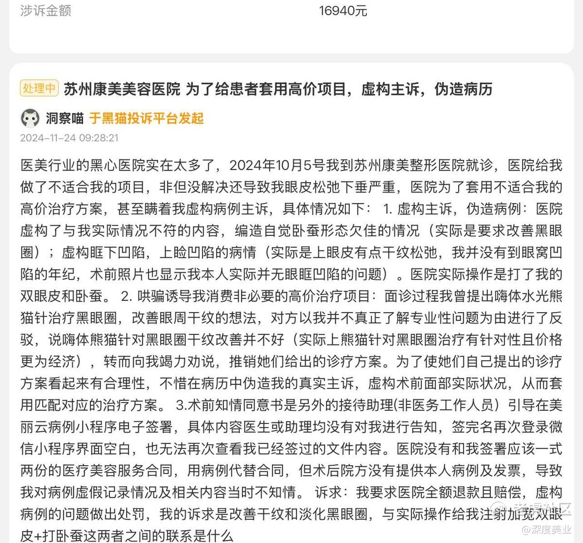 包括2024年11月24日,有消费者在黑猫投诉平台上详细叙述了自己在2024年10月5日去苏州康美美容医院的的就诊经历。