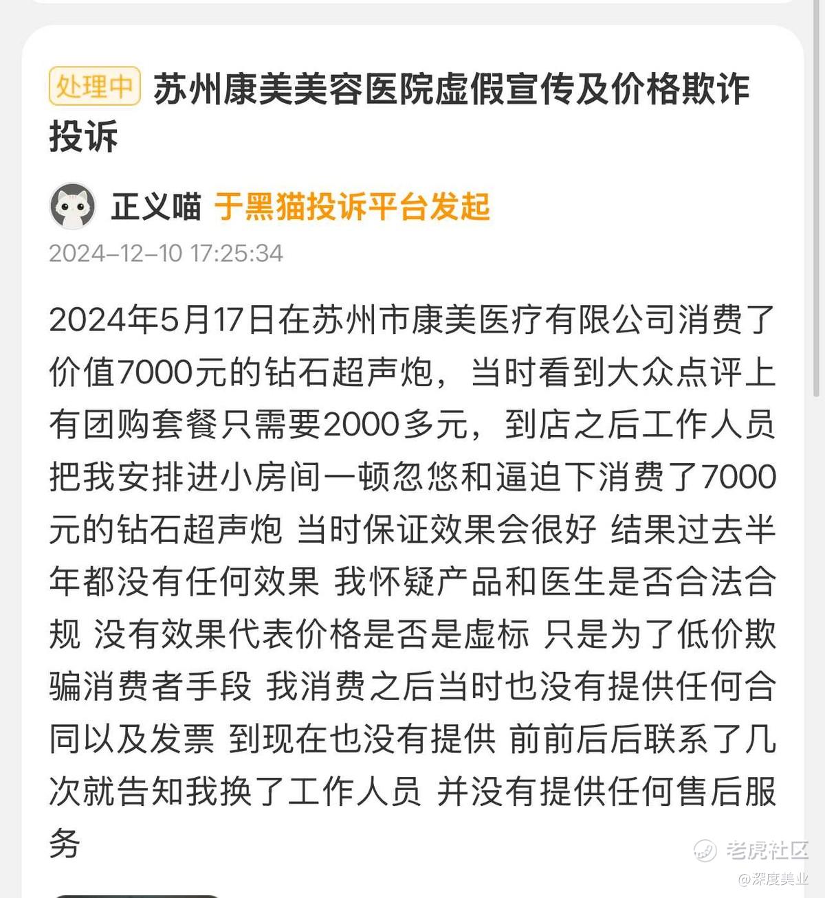 去年12月10日,有消费者在黑猫投诉平台对苏州康美医疗美容发起了投诉。