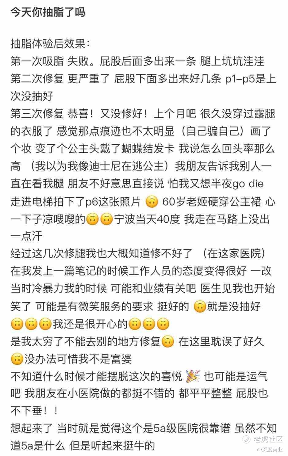 第一次吸脂手术后,她发现屁股后面多出来一条,腿部坑洼不平。