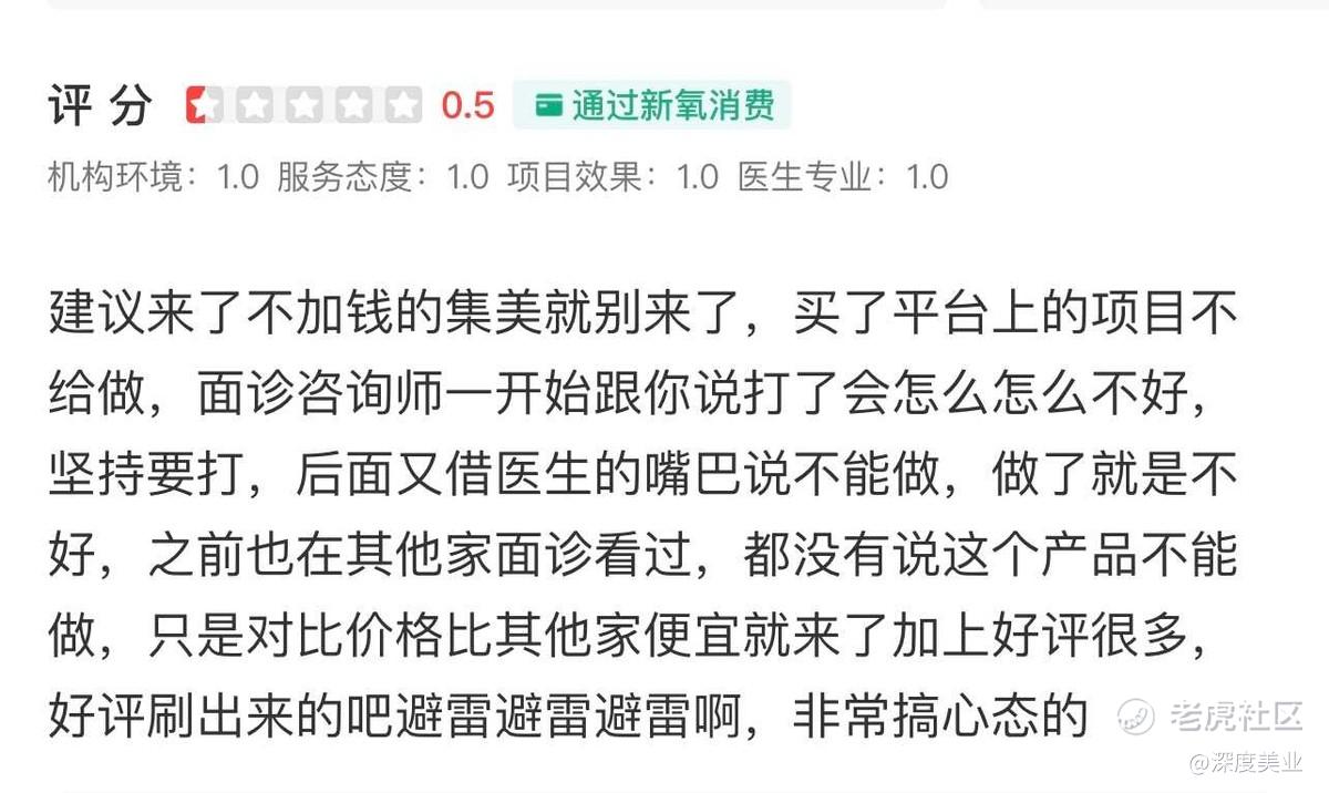 无独有偶,在医美团购平台新氧APP上,同样有消费者因苏州康美的过度推销而表示不满。