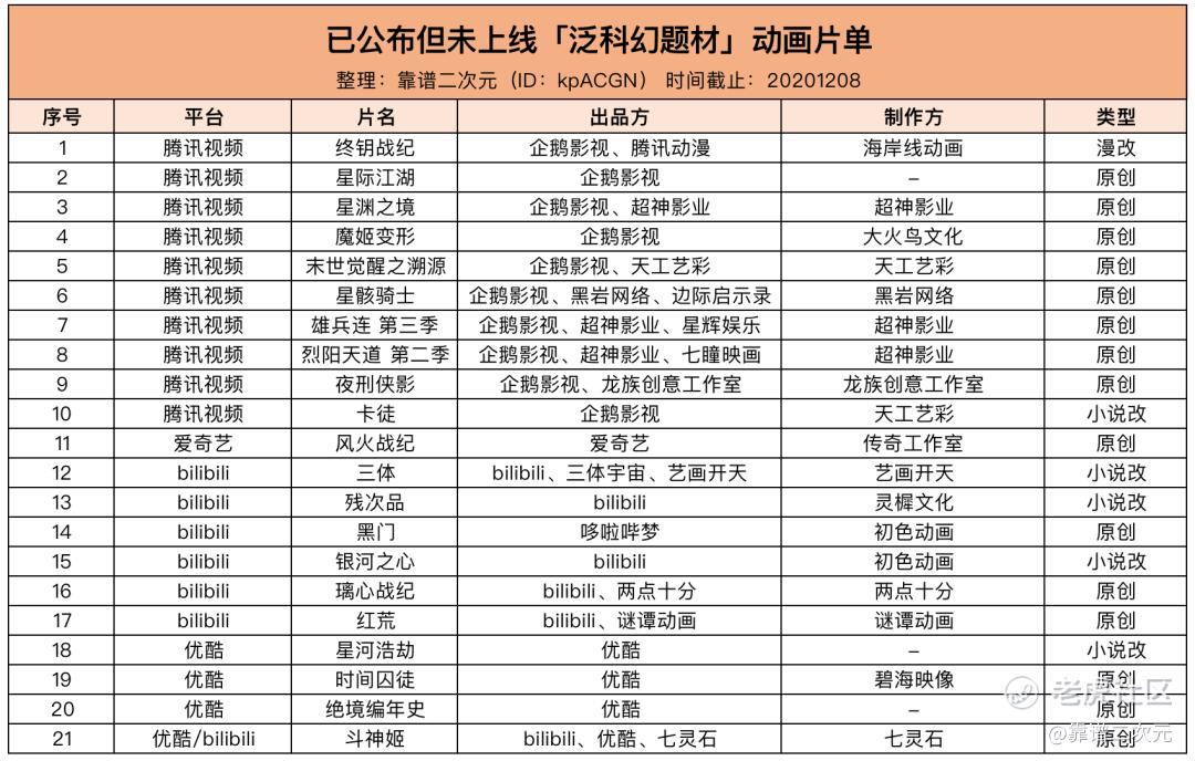靠谱二次元(ID:kpACGN)整理了最近几年腾讯视频、爱奇艺、bilibili、优酷四家视频平台公布但未上线的泛科幻题材动画片单,共21部。其中腾讯视频10部、bilibili 6部、爱奇艺1部、优酷3部,还有1部由双平台联合出品。