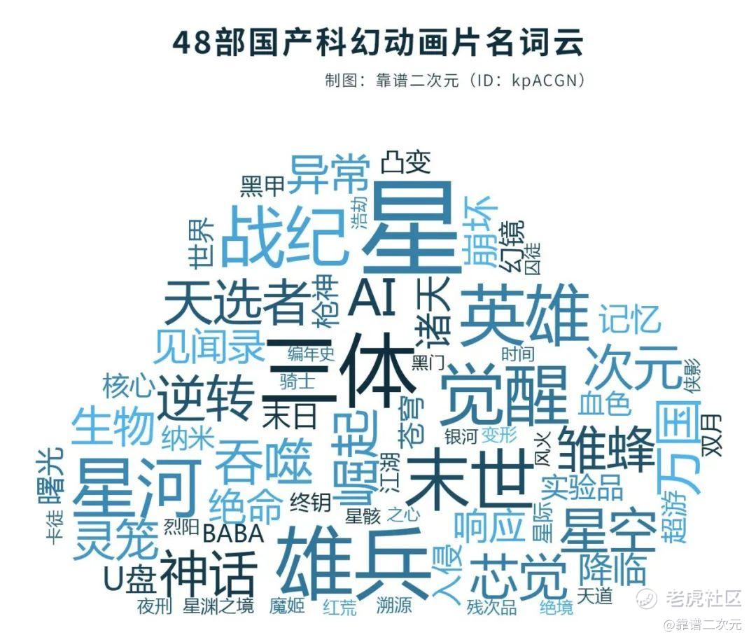 比如,靠谱二次元(ID:kpACGN)整理了上述48部作品名生成了词云,可以看出目前国产科幻动画仅从名字上看就同质化非常严重,“星x”、“战纪”、“x雄”这些都是起名时特别高频出现的词汇,其他一些比如天地、苍穹、末世、世界、觉醒、崛起等等也都是比较俗套的起名方式,随便把词语打乱顺序重组,贴在原片上改个名,也毫无违和感。