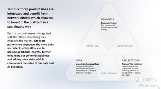 公司有三大主要产品:基因组学、数据和应用。基因组学产品涉及Tempus AI运行诊断测试,以匹配疗法并比较类似患者的治疗方案。该产品直接向保险公司开具账单或从付款人处收款。