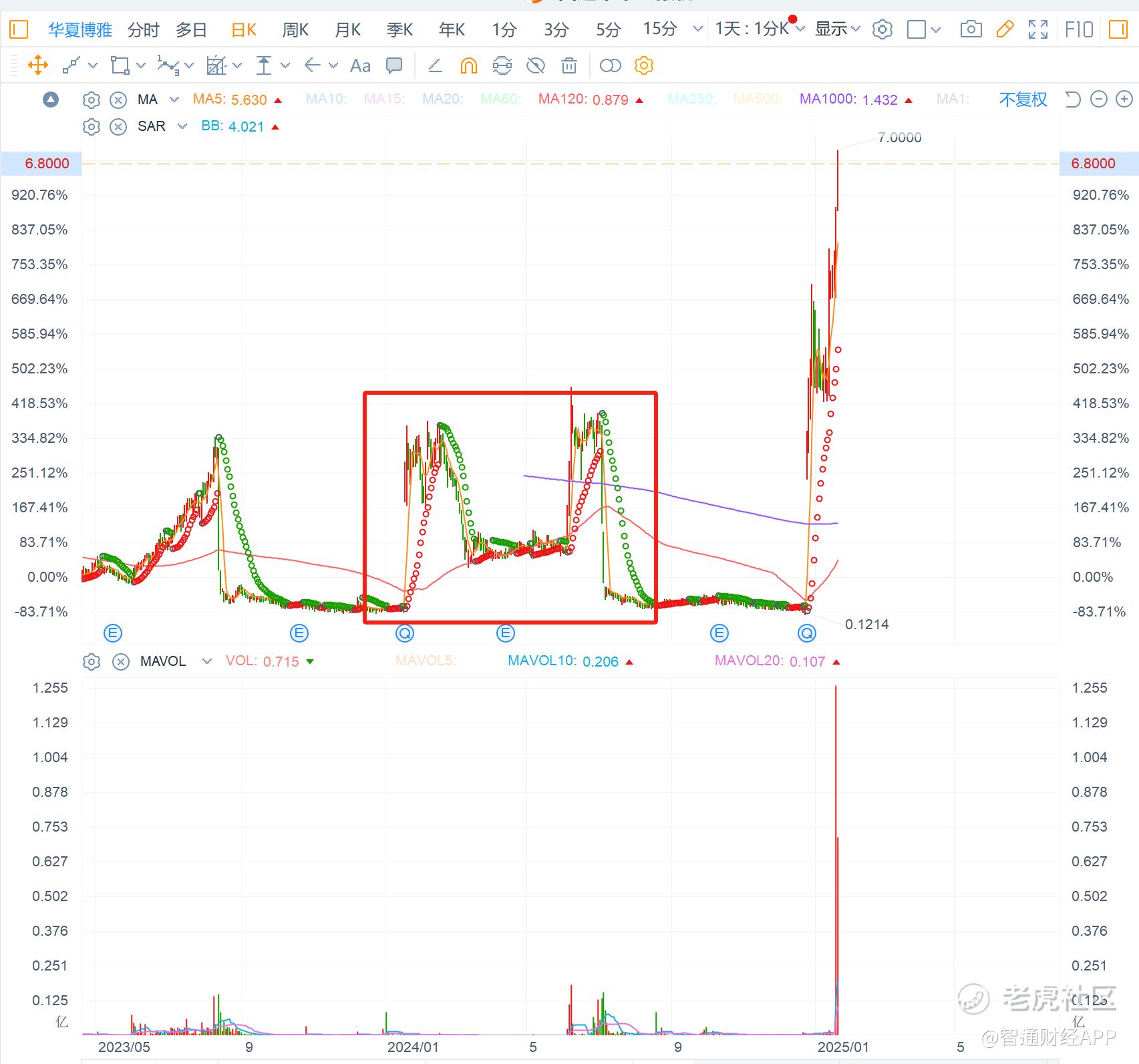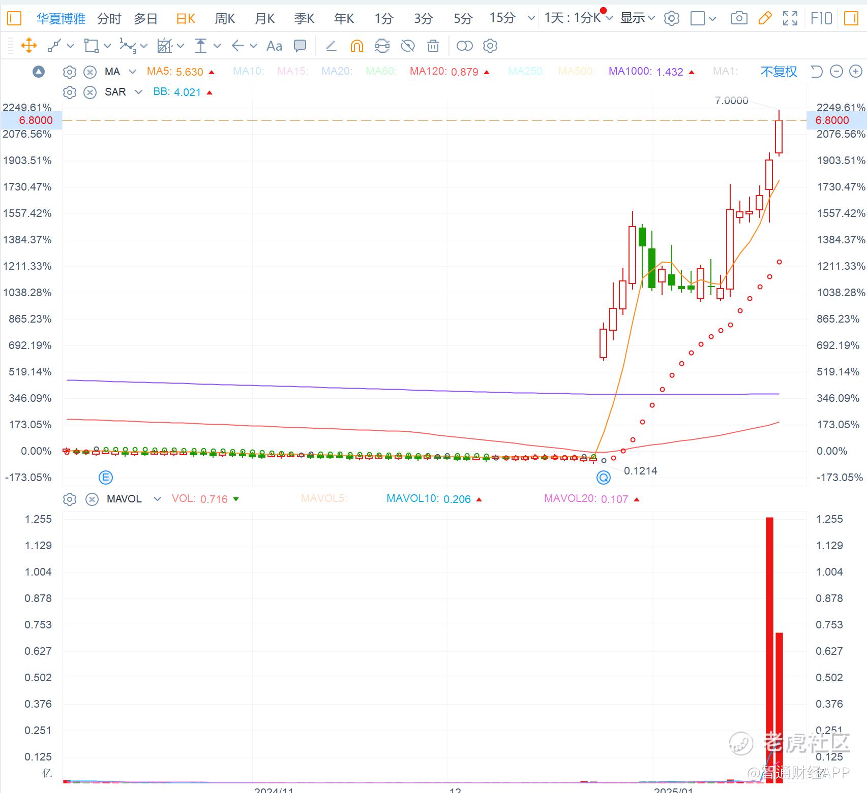 华夏博雅于 2025 年 1 月 22 日因换手率达到 500% 而受到广泛关注,当日成交额达到 6.78 亿美元,相当于其市值的 3.85 倍,成交量约 1.26 亿股,而其流通股股本仅约为 0.25 亿股(占总股本 86.6%)。在此之前,该公司成交量并不高,平均每个交易日几百万美元成交额,平均换手率在 5% 以下。