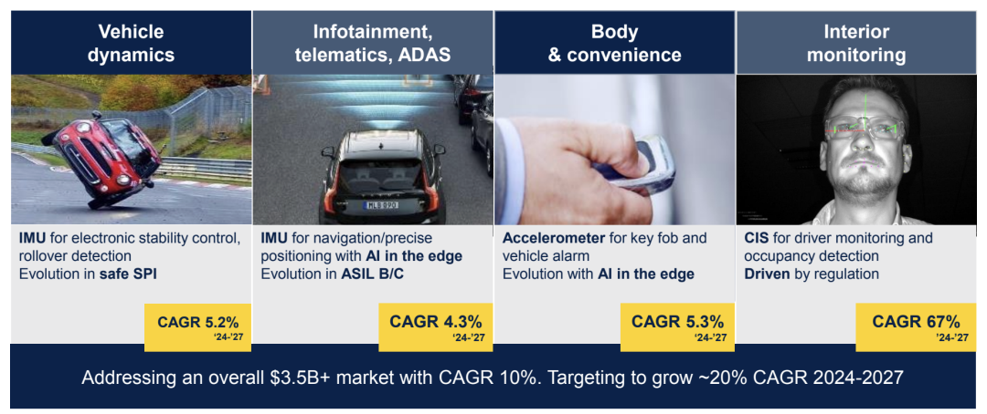 系统级的创新也在不断涌现,比如ST(意法半导体)通过协同设计传感器与其他芯片,实现了性能和能效的优化。以车载领域为例,ST的传感器解决方案已经广泛应用于自动驾驶辅助系统(ADAS)、驾驶员监控、智能照明及车内环境调控等方面。