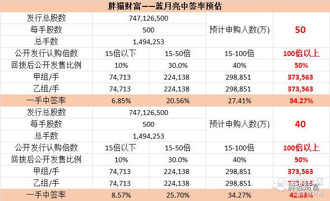 【胖猫分析】从中签率角度看,由于此次蓝月亮入场费6646.31港元,入场费定价比较亲民,此次蓝月亮大概率满回拨,预计申购人数在40~50万人左右比较合理。此次蓝月亮预计一手中签率在30%-40%,申购20-30手稳中1手,中签水平较高。
