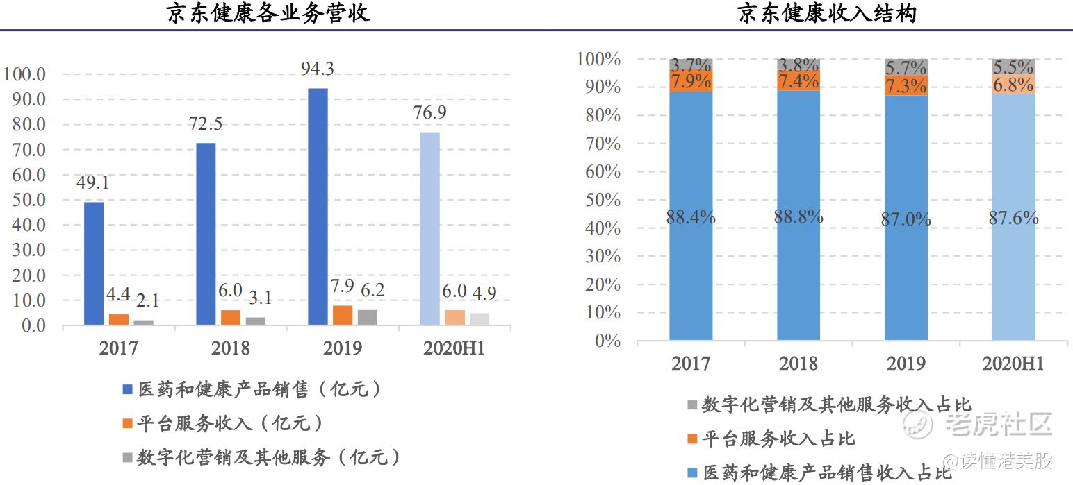 京东健康的营收大部分来自医药和健康产品的销售。2020年上半年,京东健康自营医药电商业务对应的商品收入达到76.9亿元,占比87.6%;服务收入包含平台医药电商业务的佣金和使用费收入以及数字化营销和其他服务收入,2020年上半年,平台医药电商业务的佣金和使用费收入达到6.0亿元,同比增长64.1%,数字化营销和其他服务收入达到4.9亿元,同比增长87.7%,在总收入中的占比分别为6.8%、5.5%。