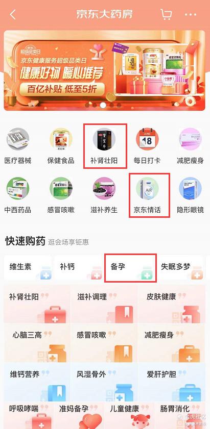 打开京东健康的APP,我们也能够看到补肾壮阳、备孕的品类在较为醒目的位置。
