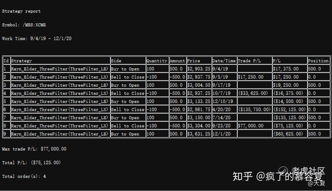 通过对比发现,除三重滤网交易策略以外,其它几种策略在MES期货交易中,均实现正收益(800刀的MES初始保证金,3年累计收益最少有1811刀,最多有2586刀。然而期货真的这么好赚钱么?下一篇文章将会展示实盘如何在MES和MYM上亏损700刀)。可以看到,几种策略整体来说可以为股指期货交易提供一定指导;再看个股,在美股阿里巴巴上,EMA对称通道和挤牌收益为负,需要进一步优化对称通道参数,同时在挤牌策略中引入其它指标。其它策略虽然收益为正,但是和买入并持有相比,收益依然较低。这几种策略同样需要引入其它指标进行改进。其实,对于阿里巴巴这种业务垄断、利润高速增长的优质股票,或许少折腾、买入、持股待涨的价值投资是最好的选择。