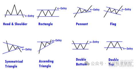 下图展示了一些常见的技术形态。这些技术形态仅仅代表统计上更有可能的走向(~70%),然而许多技术面拥趸却常常夸大其实际准确率。